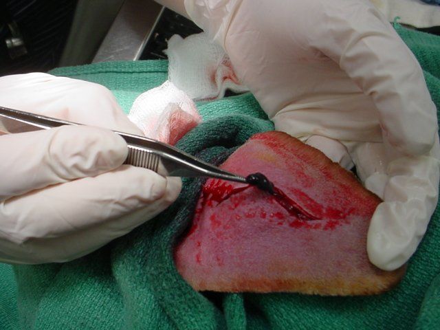Treatment is two-fold. First the hematoma must be opened to allow the blood to drain. Any blood clots and fibrous tissue are removed. The picture at the left shows blood clots and fibrous tissue.