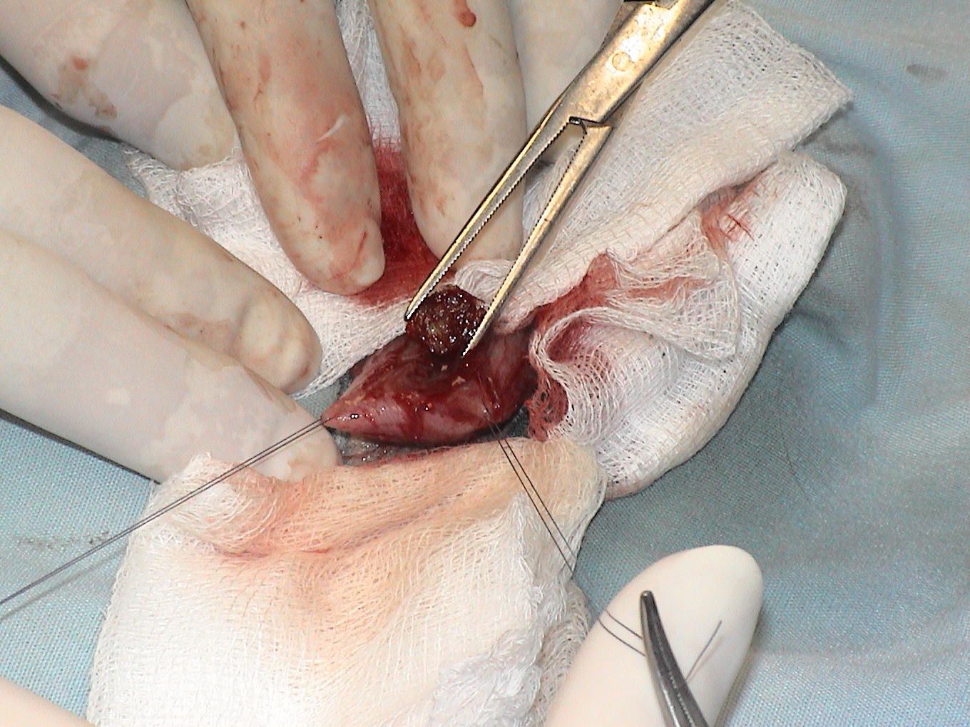 In cases of bladder stones, the fastest way for resolution of secondary infection is often stone removal. After the abdomen is opened, the bladder is isolated, exteriorized, and packed off.