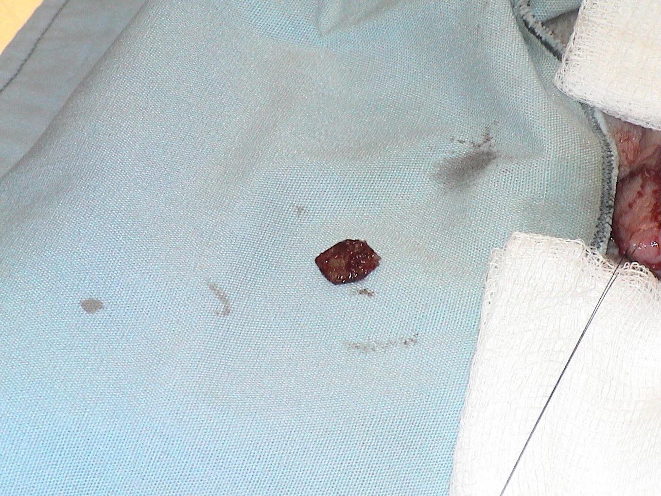 This dog only had one bladder stone measuring approx. 1 cm in lenght and width and 1/4 cm in depth. Recovery will take about 1 week. The stone will be sent to a laboratory for identification as there are may different types of stones.