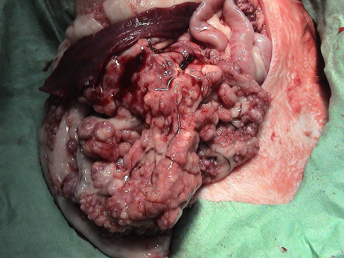 ADENOCARCINOMA is present in multiple organs and on all surfaces in the abdomen. The cat in this picture only demonstrated a loss of appetite for 2 days. Given the advanced nature of cancer, the owner elected euthanasia.