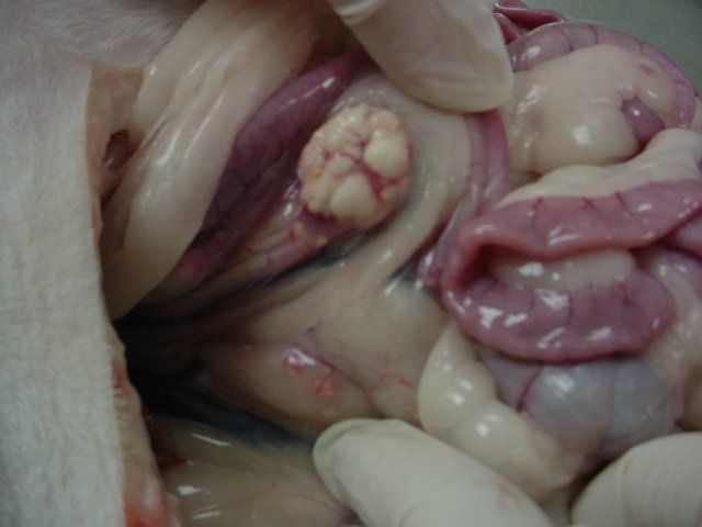 PANCREATIC TUMOR, type not diagnosed. This is a pancreatic tumor in a cat. (Round multilobed white nodule, approx. center of photo). The cat had no signs other than sudden cessation of eating. Due to the poor prognosis of pancreatic tumors in general, the owner elected euthanasia.