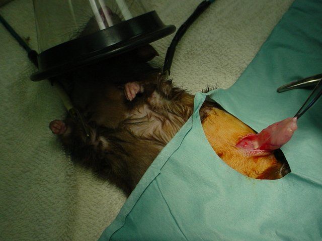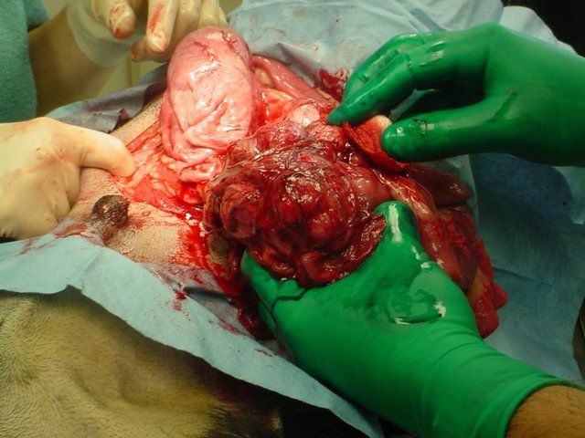 ABDOMINAL MASS, undiagnosed. This dog had a large mass of the intestine that ruptured. (The mass is within the left hand of the green-gloved surgeon.) The dog had a one-month history of weight loss, lack of appetite, and a painful abdomen. Given the extensive nature of the mass and the owner opted to euthanize the dog.