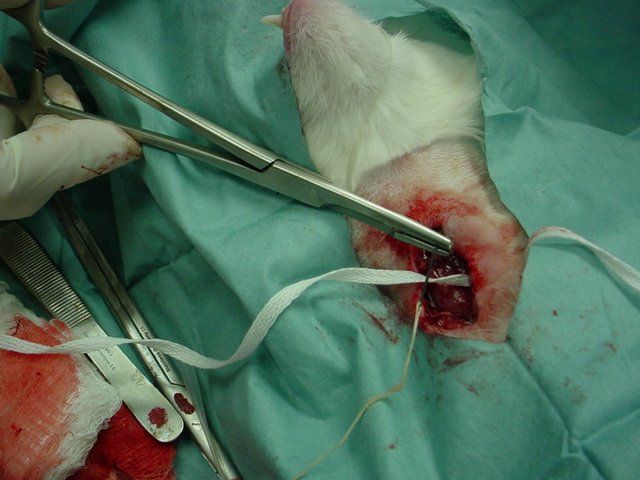 The mass on the neck was then opened and explored. A large abscess, scar tissue, and a draining track that communicated with the oral cavity were found. The needle was removed, the necrotic tissue was debrided, a drain was placed in the abscess, and the skin was sutured closed.