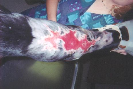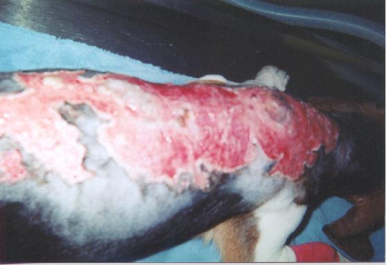 Snoopy was given anesthesia and the dead skin tissue was surgically debrided leaving infected and exposed subcutaneous tissue. Snoopy was placed on IV fluids to prevent dehydration (a large amount of fluid can be lost with such extensive skin loss), pain medications, and antibiotics.