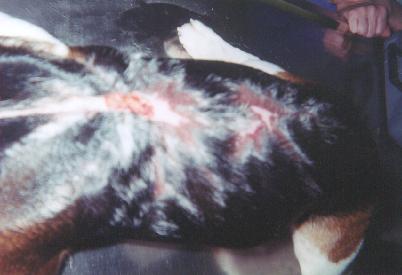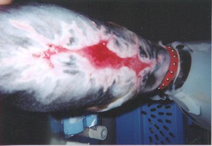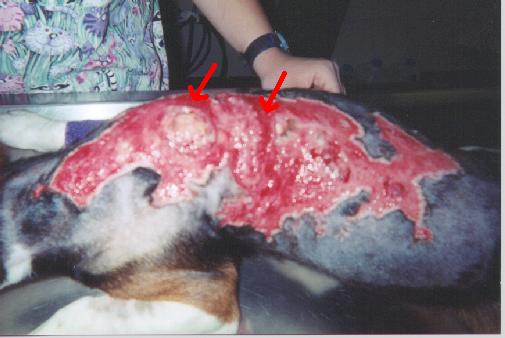 This is Snoopy. Snoopy was initially presented with a small swelling of unknown origin on his back. Over several days, a larger area of skin on his back and neck began to die. (Pictures unavailable)