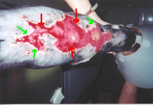 Healthy granulation tissue is very red and bleeds easily (red arrows). It is necessary for the skin to regenerate. Once a good layer of granulation tissue is present, new skin will grow from the edges of the wound and fill in towards the center. This process is very rapid.
