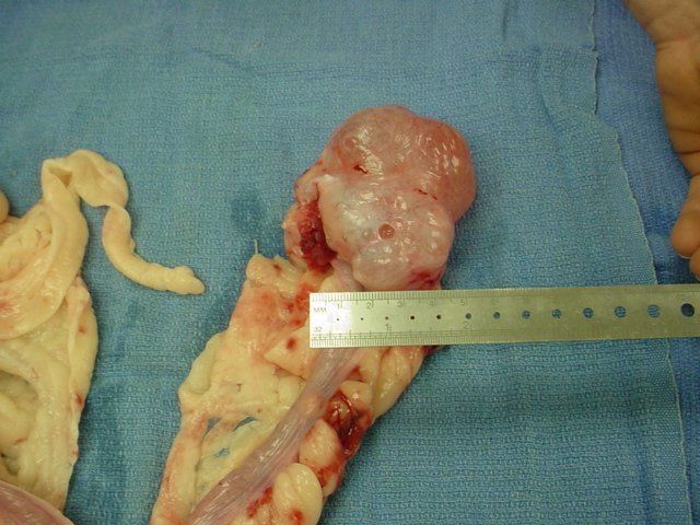 The uterus in this picture is from a cat. Normally, it would be about the width of the tips of the clamps seen in the picture. Pus can be seen draining from the cut end of the uterus.