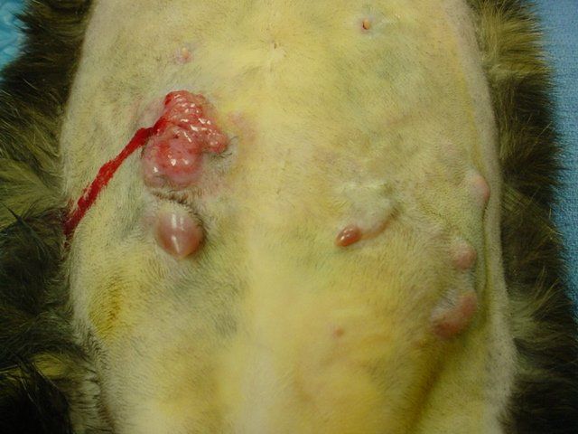 This cat has several mammary masses. Some have ruptured and are bleeding. The overall rate of survival for this cat is poor, even with radical surgery, radiation, and/or chemotherapy. Mammary masses should be removed when they are small and first detected as the survival rate is often better if removed early.